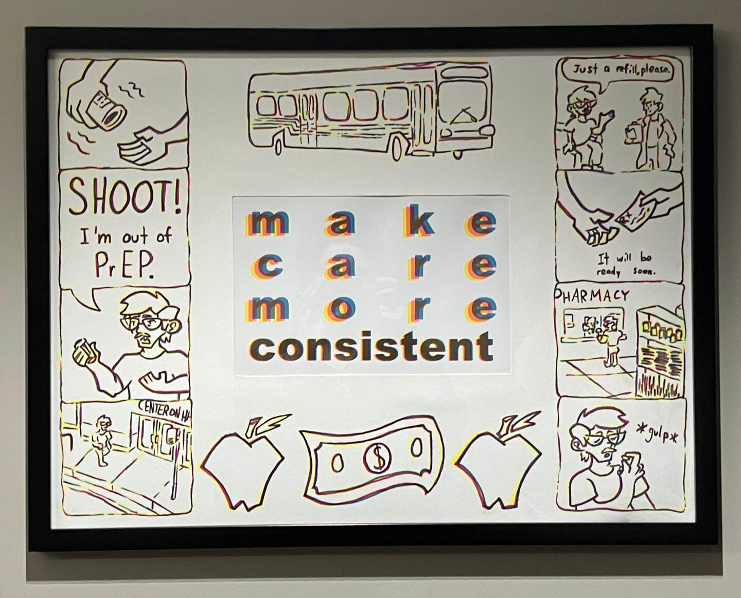 The first piece 'building better care' explores how with several effective tools to end the spread of HIV, the ACCELERATE program aims to get those treatments, prevention programs, and practices to those in need faster and more efficiently. Not needing to reinvent the wheel allows ACCELERATE to continue building on top of already existing successful programs and dismantle barriers overcomplicating care. This painting mirrors this process by literally carving away unnecessary pieces and further constructing atop pre-existing forms.The second piece 'make care more consistent' focuses on projects CLEARS-HIV and CEASE-HIV’s goals to increase patient retention and overcome systemic barriers preventing people with complex needs from accessing long-term healthcare support, this comic utilizes a layered artmaking process to demonstrate the multifaceted social factors inhibiting people from reaching an undetectable HIV status. Rather than trying to circumnavigate a patient’s complex needs, CLEARS-HIV and CEASE-HIV address those issues directly through methods such as providing low-barrier walk-in clinic hours, financial counseling, personal case managers, transportation options, food, and financial incentives. When given this support the layered issues that once prevented a patient from receiving consistent access to healthcare can come into alignment and form a clear picture.
